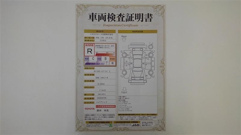 詳細及び現状の車両状態につきましては、店舗スタッフまでお尋ねください。 - 注2)上記と同様の評価点・状態表を「車両検査証明書」として店舗の展示車両に搭載しております。
