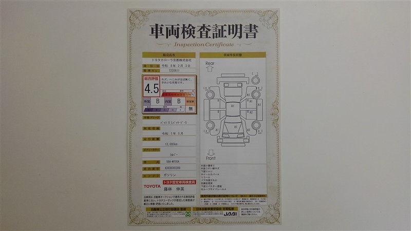 詳細及び現状の車両状態につきましては、店舗スタッフまでお尋ねください。 - 注2)上記と同様の評価点・状態表を「車両検査証明書」として店舗の展示車両に搭載しております。