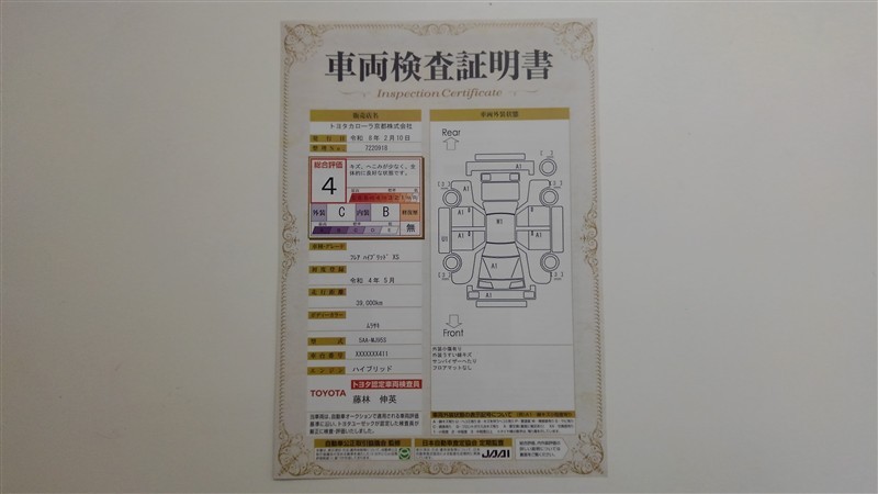 詳細及び現状の車両状態につきましては、店舗スタッフまでお尋ねください。 - 注2)上記と同様の評価点・状態表を「車両検査証明書」として店舗の展示車両に搭載しております。
