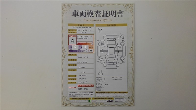 詳細及び現状の車両状態につきましては、店舗スタッフまでお尋ねください。 - 注2)上記と同様の評価点・状態表を「車両検査証明書」として店舗の展示車両に搭載しております。