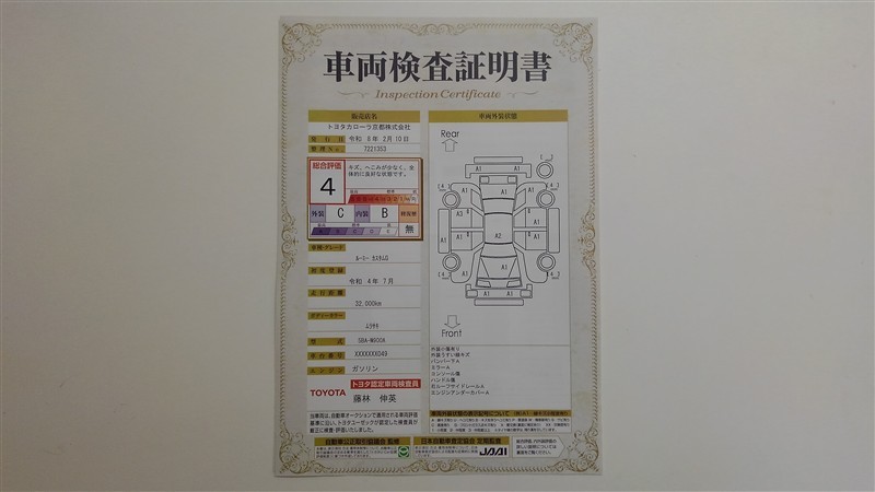 詳細及び現状の車両状態につきましては、店舗スタッフまでお尋ねください。 - 注2)上記と同様の評価点・状態表を「車両検査証明書」として店舗の展示車両に搭載しております。