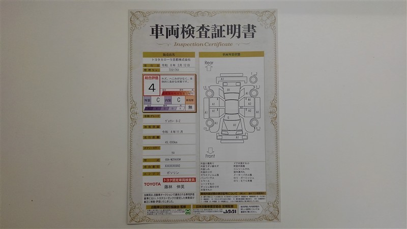 詳細及び現状の車両状態につきましては、店舗スタッフまでお尋ねください。 - 注2)上記と同様の評価点・状態表を「車両検査証明書」として店舗の展示車両に搭載しております。