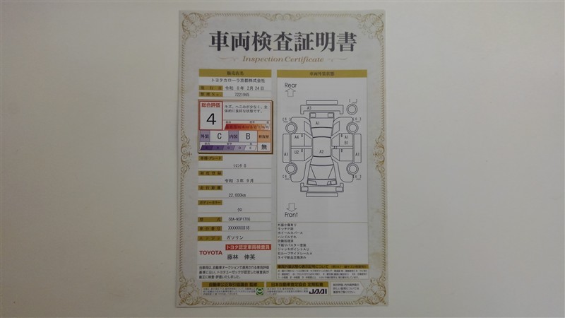 詳細及び現状の車両状態につきましては、店舗スタッフまでお尋ねください。 - 注2)上記と同様の評価点・状態表を「車両検査証明書」として店舗の展示車両に搭載しております。