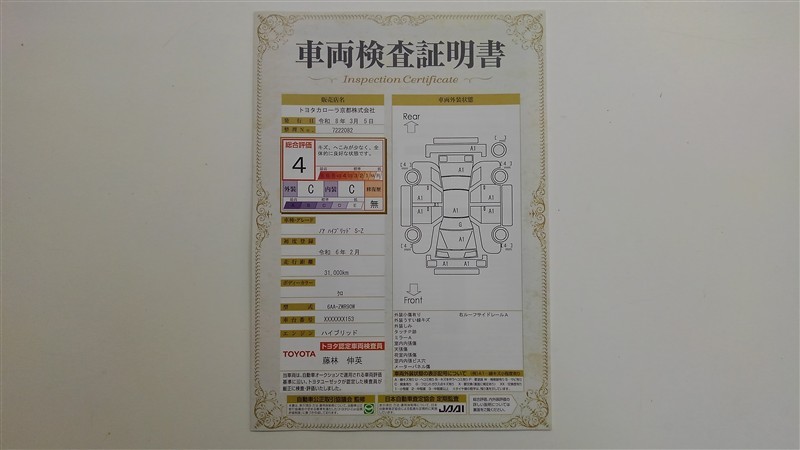 詳細及び現状の車両状態につきましては、店舗スタッフまでお尋ねください。 - 注2)上記と同様の評価点・状態表を「車両検査証明書」として店舗の展示車両に搭載しております。