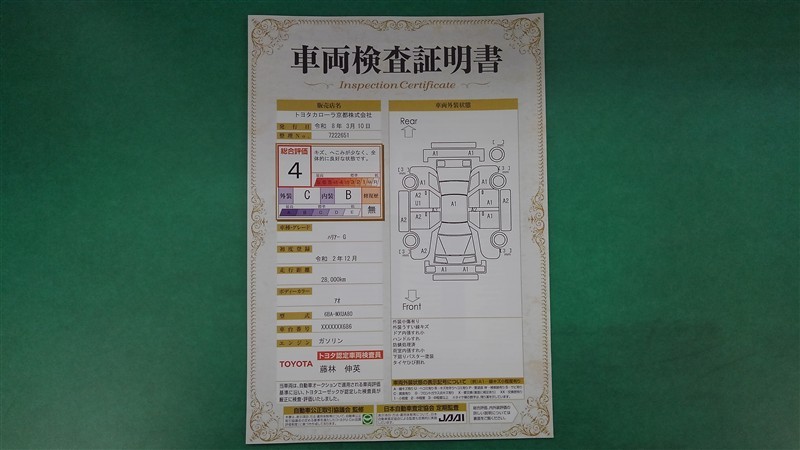 詳細及び現状の車両状態につきましては、店舗スタッフまでお尋ねください。 - 注2)上記と同様の評価点・状態表を「車両検査証明書」として店舗の展示車両に搭載しております。