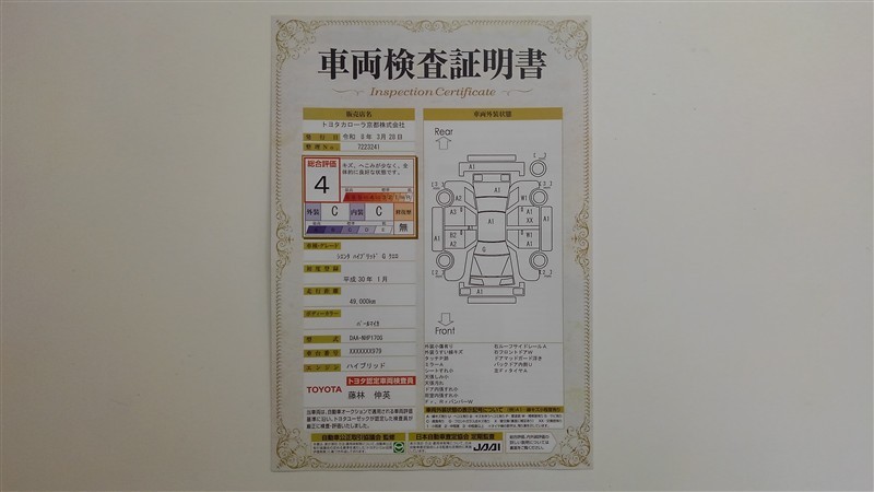 詳細及び現状の車両状態につきましては、店舗スタッフまでお尋ねください。 - 注2)上記と同様の評価点・状態表を「車両検査証明書」として店舗の展示車両に搭載しております。