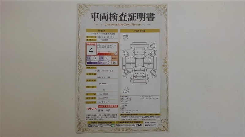 詳細及び現状の車両状態につきましては、店舗スタッフまでお尋ねください。 - 注2)上記と同様の評価点・状態表を「車両検査証明書」として店舗の展示車両に搭載しております。