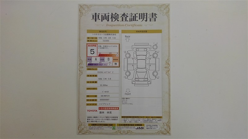 詳細及び現状の車両状態につきましては、店舗スタッフまでお尋ねください。 - 注2)上記と同様の評価点・状態表を「車両検査証明書」として店舗の展示車両に搭載しております。