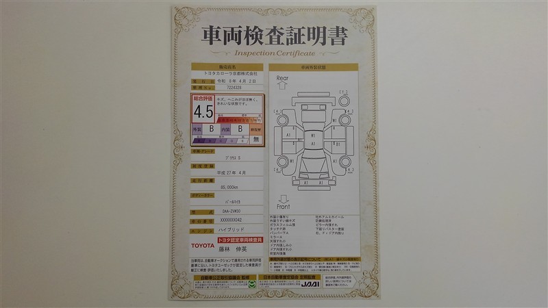 詳細及び現状の車両状態につきましては、店舗スタッフまでお尋ねください。 - 注2)上記と同様の評価点・状態表を「車両検査証明書」として店舗の展示車両に搭載しております。
