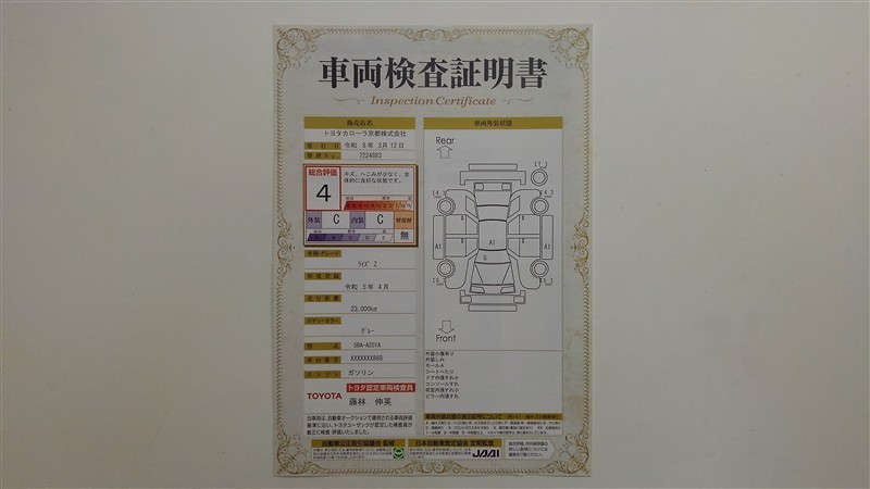 詳細及び現状の車両状態につきましては、店舗スタッフまでお尋ねください。 - 注2)上記と同様の評価点・状態表を「車両検査証明書」として店舗の展示車両に搭載しております。
