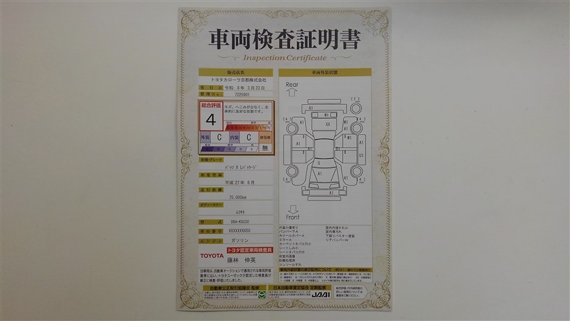 詳細及び現状の車両状態につきましては、店舗スタッフまでお尋ねください。 - 注2)上記と同様の評価点・状態表を「車両検査証明書」として店舗の展示車両に搭載しております。