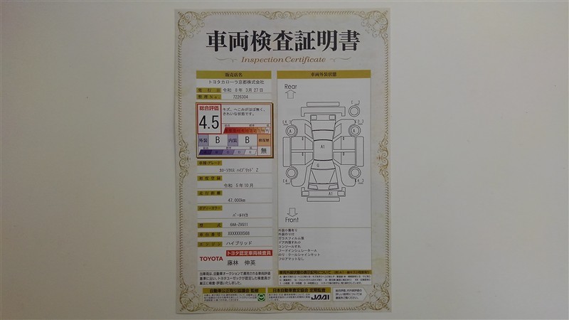 詳細及び現状の車両状態につきましては、店舗スタッフまでお尋ねください。 - 注2)上記と同様の評価点・状態表を「車両検査証明書」として店舗の展示車両に搭載しております。