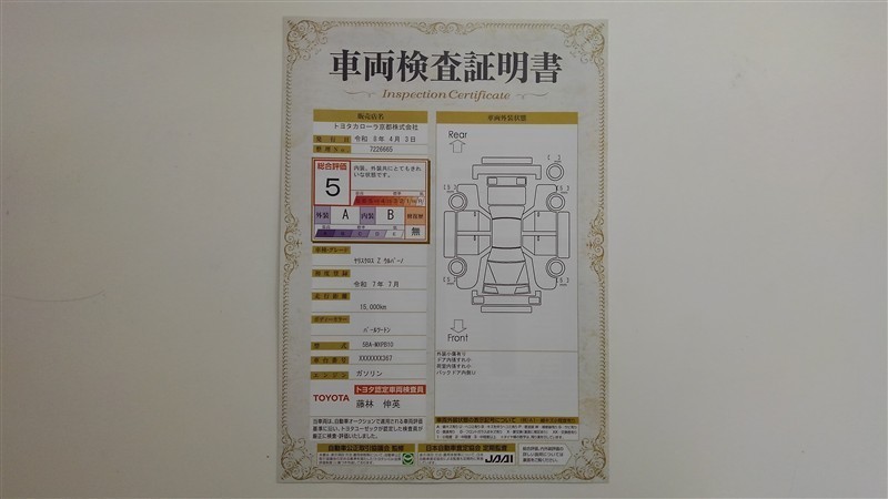 上記と同様の評価点・状態表を「車両検査証明書」として店舗の展示車両に搭載しております。