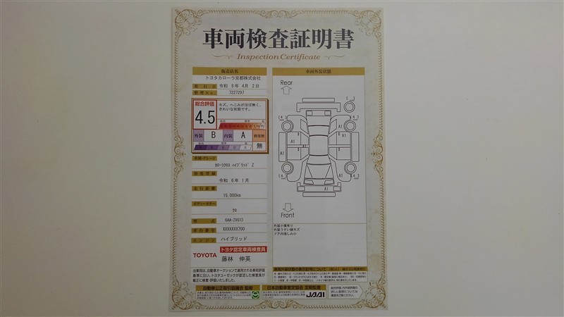 詳細及び現状の車両状態につきましては、店舗スタッフまでお尋ねください。 - 注2)上記と同様の評価点・状態表を「車両検査証明書」として店舗の展示車両に搭載しております。