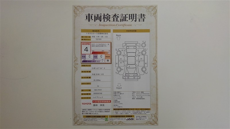 詳細及び現状の車両状態につきましては、店舗スタッフまでお尋ねください。 - 注2)上記と同様の評価点・状態表を「車両検査証明書」として店舗の展示車両に搭載しております。