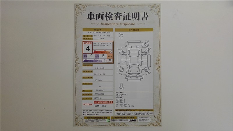 詳細及び現状の車両状態につきましては、店舗スタッフまでお尋ねください。 - 注2)上記と同様の評価点・状態表を「車両検査証明書」として店舗の展示車両に搭載しております。