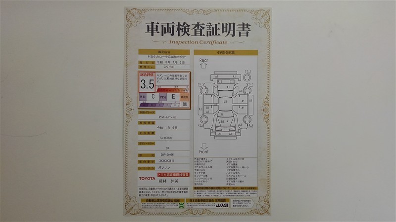 詳細及び現状の車両状態につきましては、店舗スタッフまでお尋ねください。 - 注2)上記と同様の評価点・状態表を「車両検査証明書」として店舗の展示車両に搭載しております。