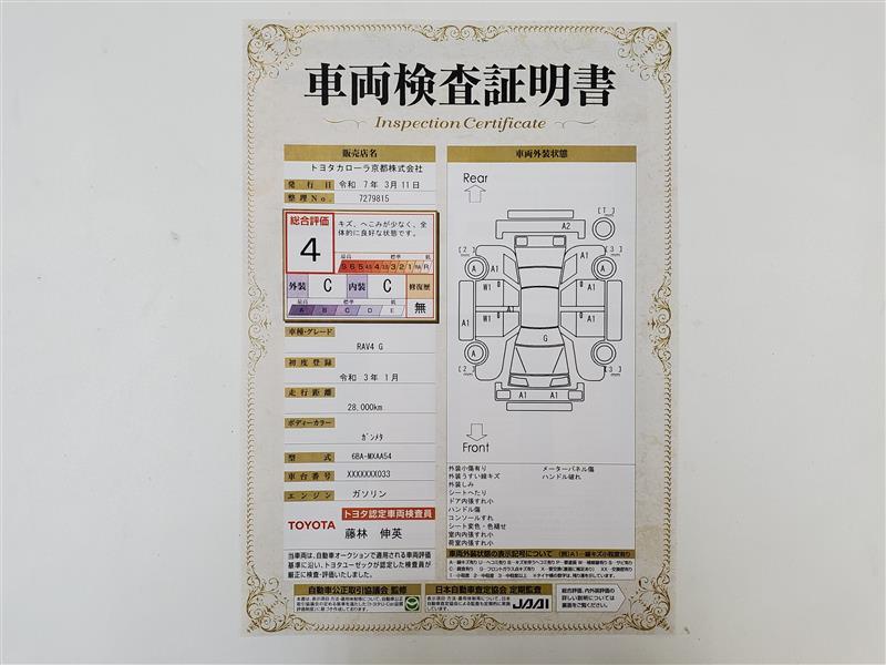 詳細及び現状の車両状態につきましては、店舗スタッフまでお尋ねください。 - 注2)上記と同様の評価点・状態表を「車両検査証明書」として店舗の展示車両に搭載しております。