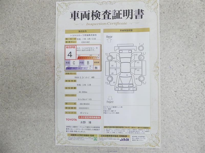詳細及び現状の車両状態につきましては、店舗スタッフまでお尋ねください。 - 注2)上記と同様の評価点・状態表を「車両検査証明書」として店舗の展示車両に搭載しております。