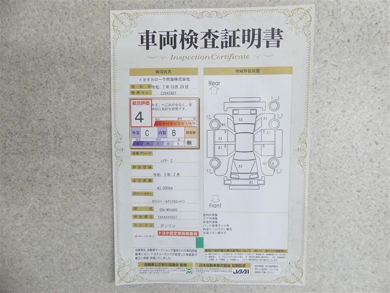 詳細及び現状の車両状態につきましては、店舗スタッフまでお尋ねください。 - 注2)上記と同様の評価点・状態表を「車両検査証明書」として店舗の展示車両に搭載しております。