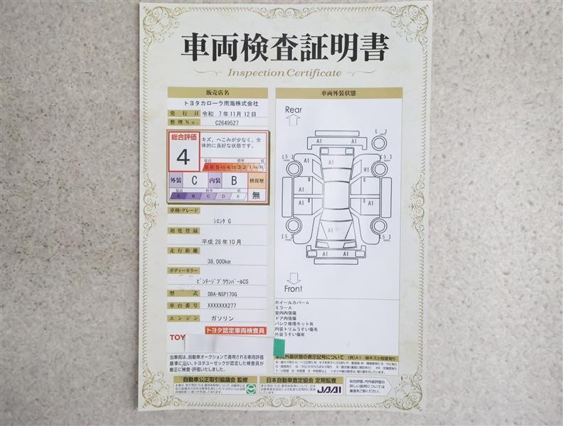 詳細及び現状の車両状態につきましては、店舗スタッフまでお尋ねください。 - 注2)上記と同様の評価点・状態表を「車両検査証明書」として店舗の展示車両に搭載しております。