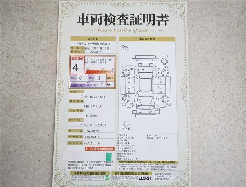 詳細及び現状の車両状態につきましては、店舗スタッフまでお尋ねください。 - 注2)上記と同様の評価点・状態表を「車両検査証明書」として店舗の展示車両に搭載しております。