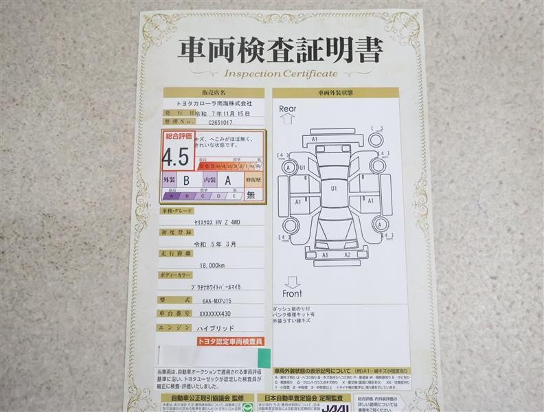詳細及び現状の車両状態につきましては、店舗スタッフまでお尋ねください。 - 注2)上記と同様の評価点・状態表を「車両検査証明書」として店舗の展示車両に搭載しております。