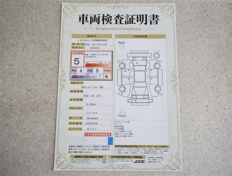 詳細及び現状の車両状態につきましては、店舗スタッフまでお尋ねください。 - 注2)上記と同様の評価点・状態表を「車両検査証明書」として店舗の展示車両に搭載しております。