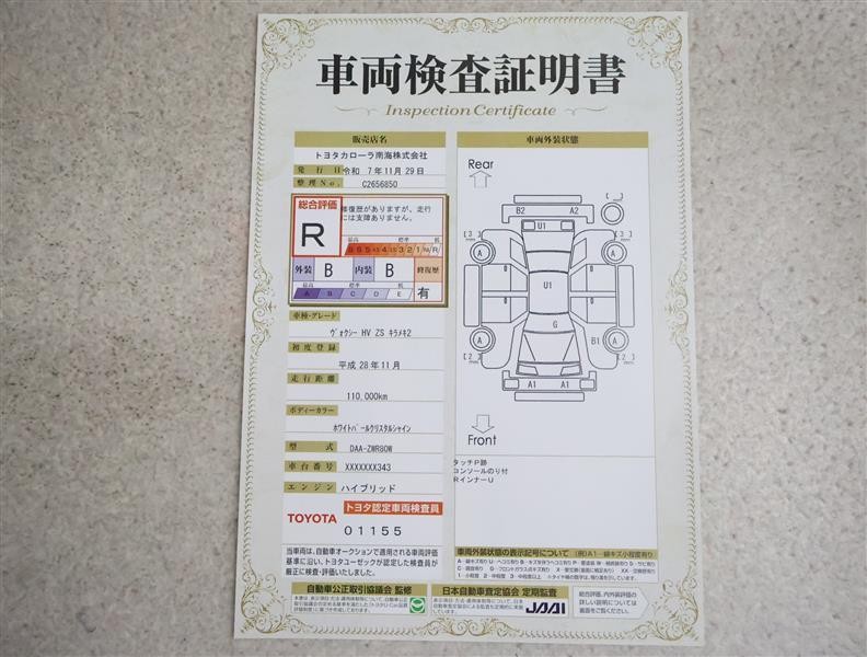 詳細及び現状の車両状態につきましては、店舗スタッフまでお尋ねください。 - 注2)上記と同様の評価点・状態表を「車両検査証明書」として店舗の展示車両に搭載しております。