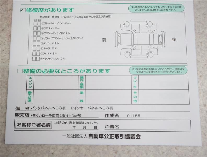 - 「修復歴あり」の場合、修復部位の詳細につきましては、販売店へお問合せください。