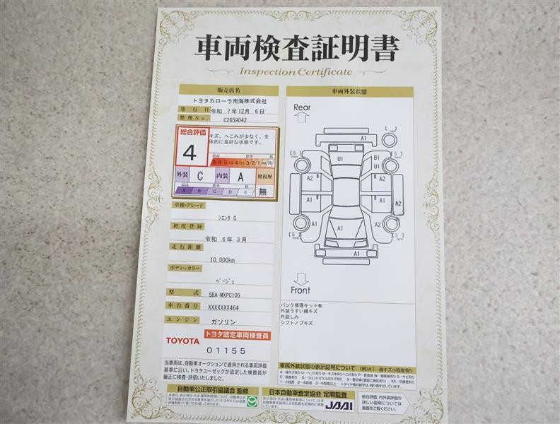 詳細及び現状の車両状態につきましては、店舗スタッフまでお尋ねください。 - 注2)上記と同様の評価点・状態表を「車両検査証明書」として店舗の展示車両に搭載しております。