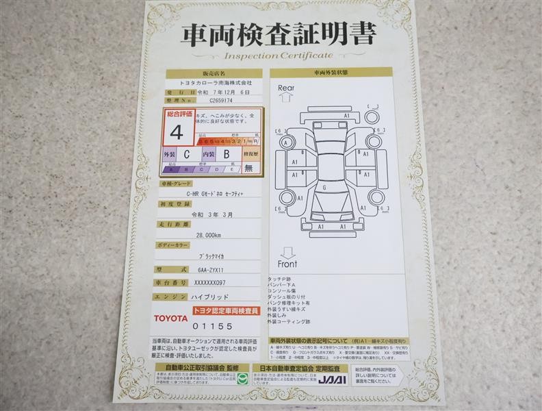 詳細及び現状の車両状態につきましては、店舗スタッフまでお尋ねください。 - 注2)上記と同様の評価点・状態表を「車両検査証明書」として店舗の展示車両に搭載しております。