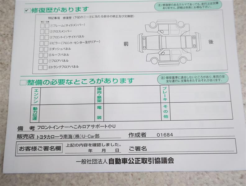 - 「修復歴あり」の場合、修復部位の詳細につきましては、販売店へお問合せください。