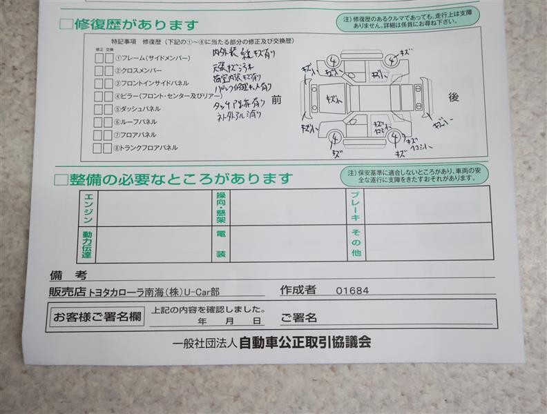 - 「修復歴あり」の場合、修復部位の詳細につきましては、販売店へお問合せください。