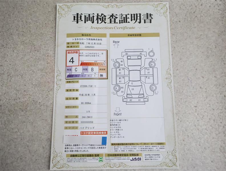 詳細及び現状の車両状態につきましては、店舗スタッフまでお尋ねください。 - 注2)上記と同様の評価点・状態表を「車両検査証明書」として店舗の展示車両に搭載しております。