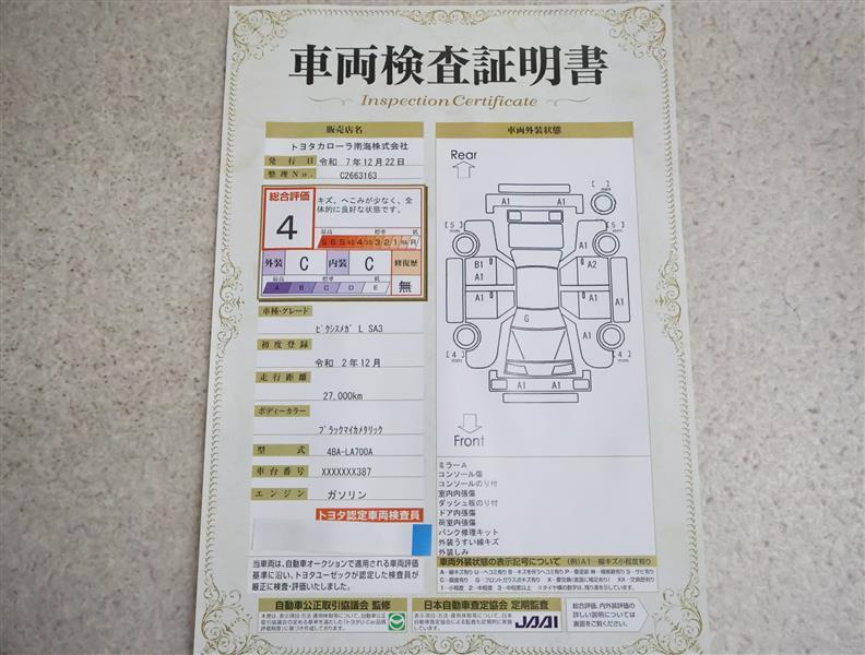 詳細及び現状の車両状態につきましては、店舗スタッフまでお尋ねください。 - 注2)上記と同様の評価点・状態表を「車両検査証明書」として店舗の展示車両に搭載しております。