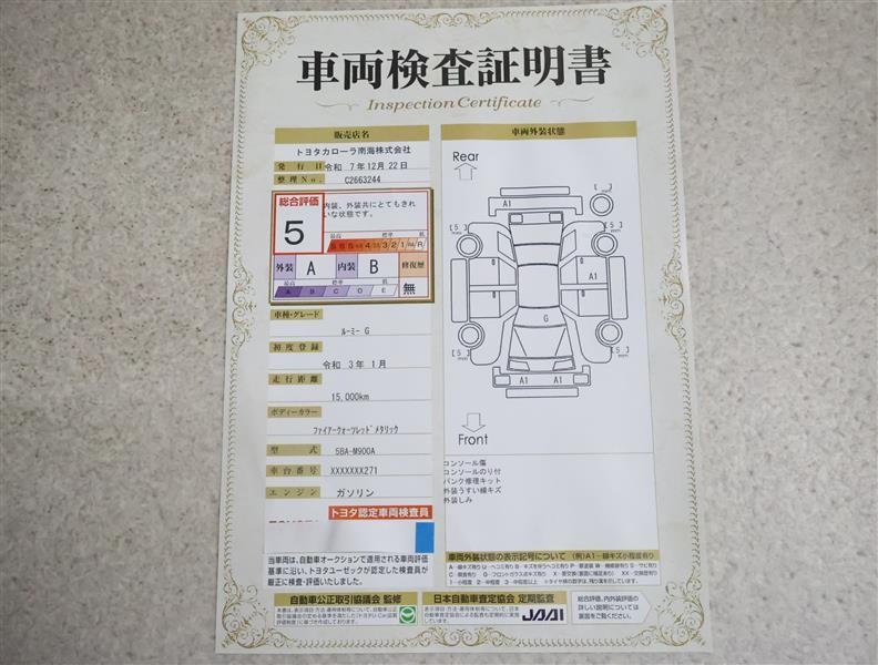 詳細及び現状の車両状態につきましては、店舗スタッフまでお尋ねください。 - 注2)上記と同様の評価点・状態表を「車両検査証明書」として店舗の展示車両に搭載しております。