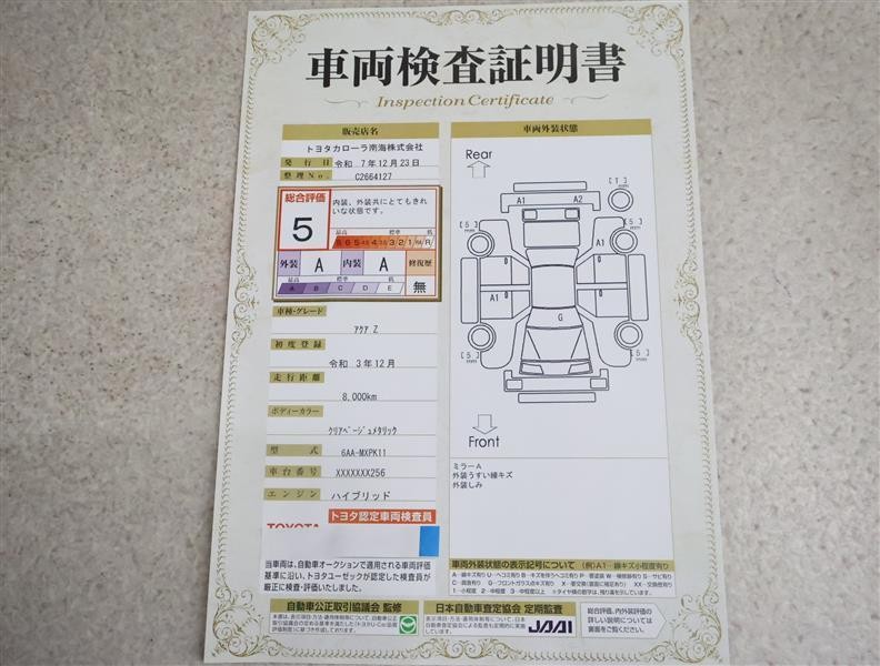詳細及び現状の車両状態につきましては、店舗スタッフまでお尋ねください。 - 注2)上記と同様の評価点・状態表を「車両検査証明書」として店舗の展示車両に搭載しております。
