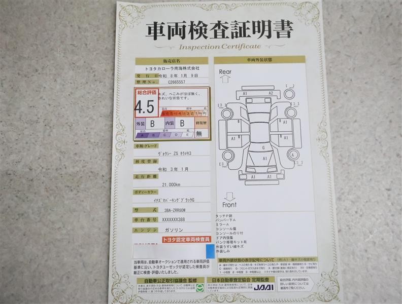 詳細及び現状の車両状態につきましては、店舗スタッフまでお尋ねください。 - 注2)上記と同様の評価点・状態表を「車両検査証明書」として店舗の展示車両に搭載しております。