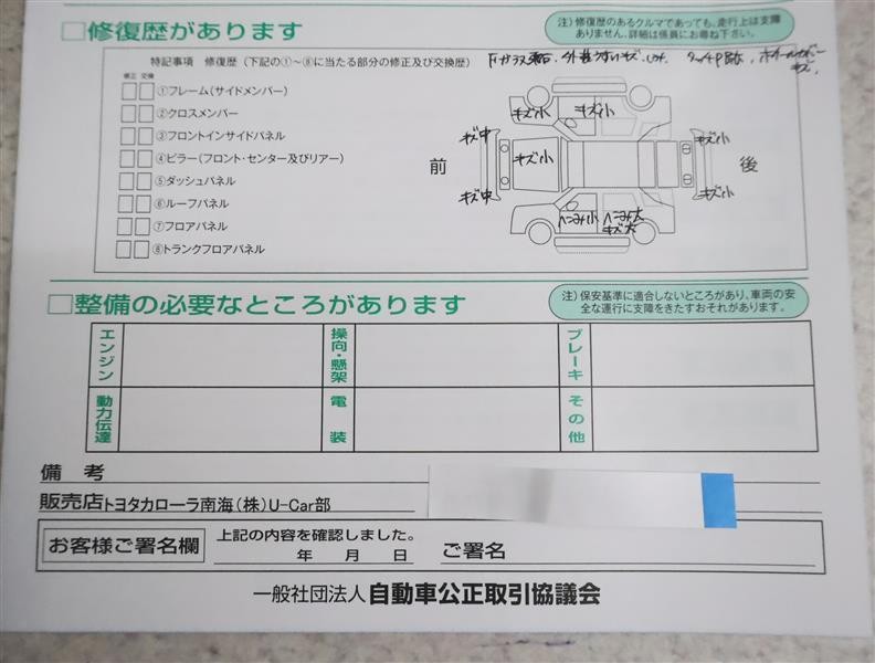 - 「定期点検整備なし(要整備箇所あり)」の場合、整備箇所につきましては、販売店へお問合せください。