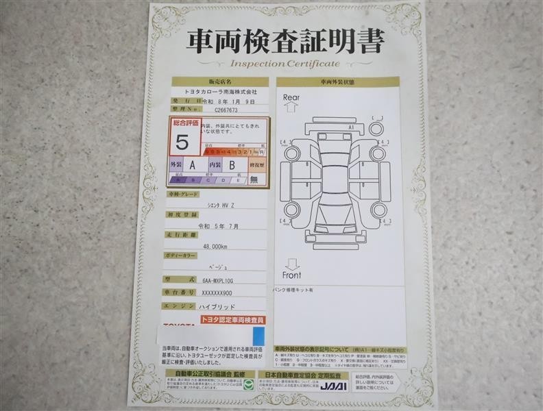 詳細及び現状の車両状態につきましては、店舗スタッフまでお尋ねください。 - 注2)上記と同様の評価点・状態表を「車両検査証明書」として店舗の展示車両に搭載しております。