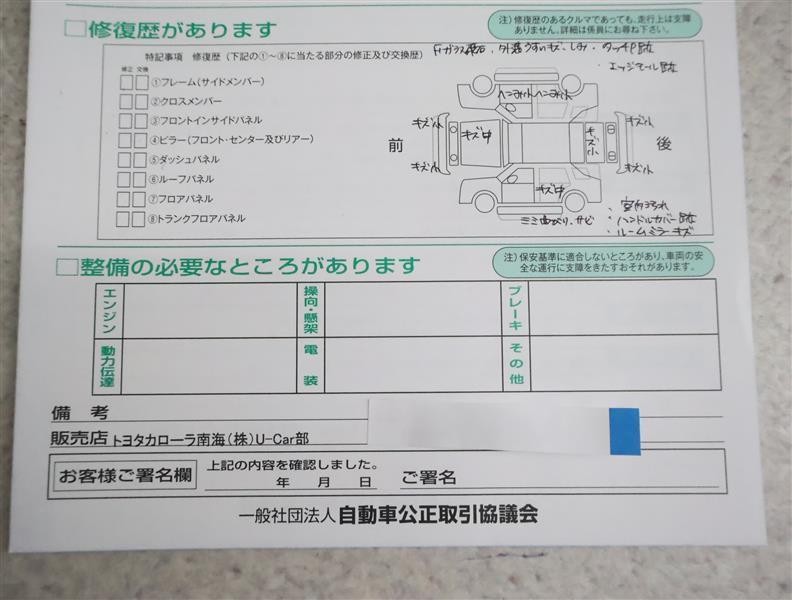 - 「定期点検整備なし(要整備箇所あり)」の場合、整備箇所につきましては、販売店へお問合せください。