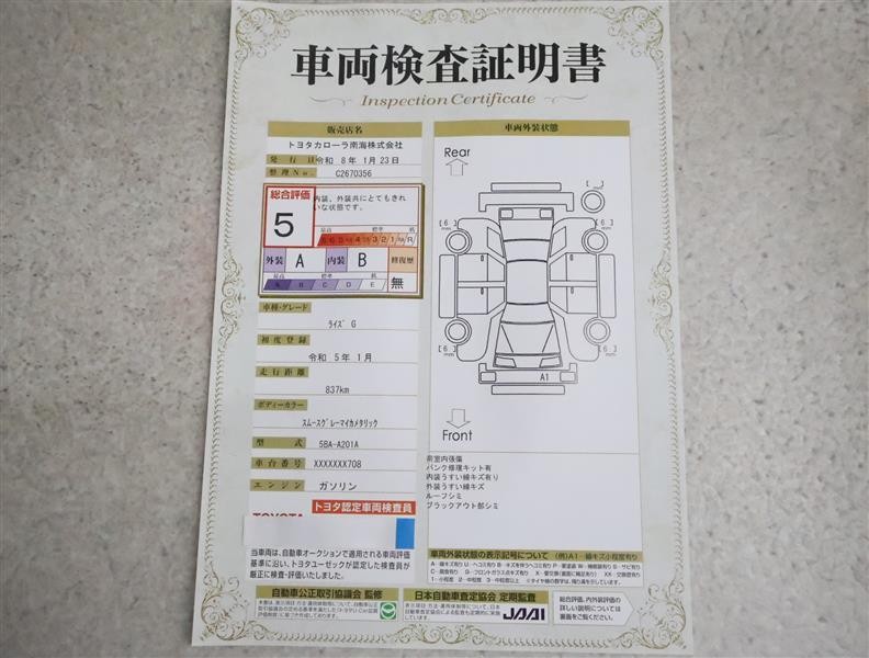詳細及び現状の車両状態につきましては、店舗スタッフまでお尋ねください。 - 注2)上記と同様の評価点・状態表を「車両検査証明書」として店舗の展示車両に搭載しております。