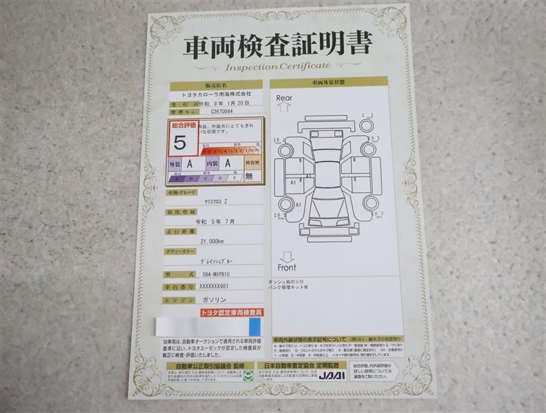 詳細及び現状の車両状態につきましては、店舗スタッフまでお尋ねください。 - 注2)上記と同様の評価点・状態表を「車両検査証明書」として店舗の展示車両に搭載しております。