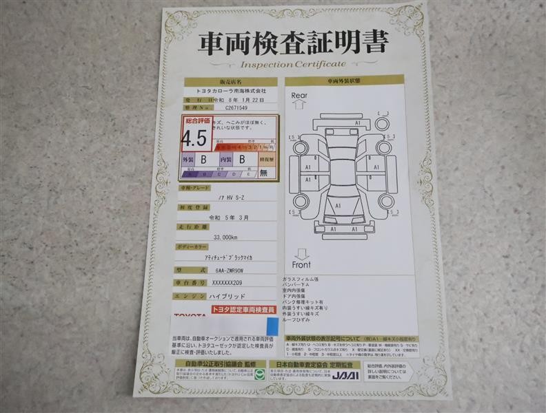 詳細及び現状の車両状態につきましては、店舗スタッフまでお尋ねください。 - 注2)上記と同様の評価点・状態表を「車両検査証明書」として店舗の展示車両に搭載しております。