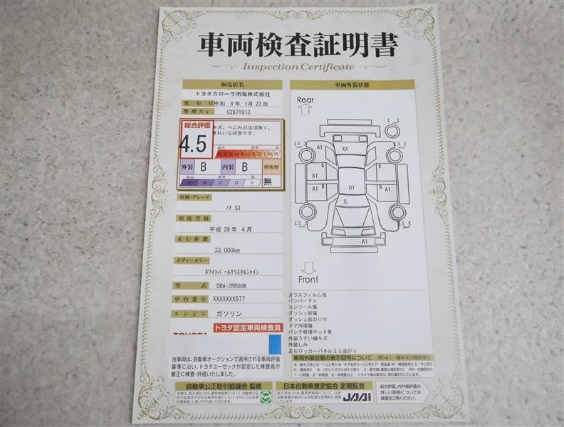 詳細及び現状の車両状態につきましては、店舗スタッフまでお尋ねください。 - 注2)上記と同様の評価点・状態表を「車両検査証明書」として店舗の展示車両に搭載しております。