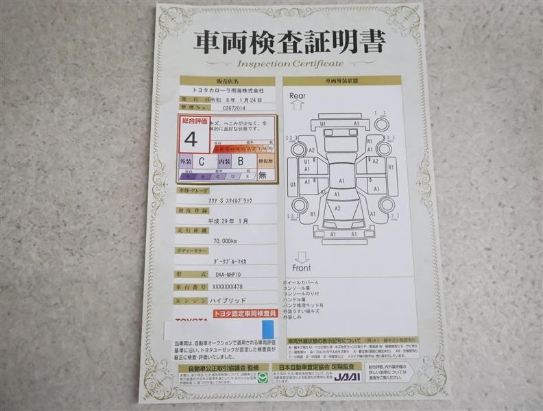 詳細及び現状の車両状態につきましては、店舗スタッフまでお尋ねください。 - 注2)上記と同様の評価点・状態表を「車両検査証明書」として店舗の展示車両に搭載しております。