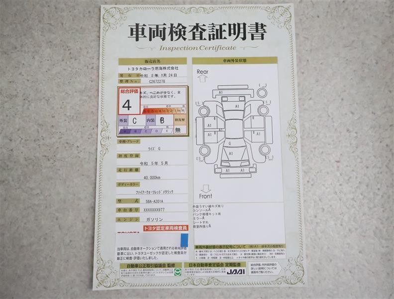 詳細及び現状の車両状態につきましては、店舗スタッフまでお尋ねください。 - 注2)上記と同様の評価点・状態表を「車両検査証明書」として店舗の展示車両に搭載しております。