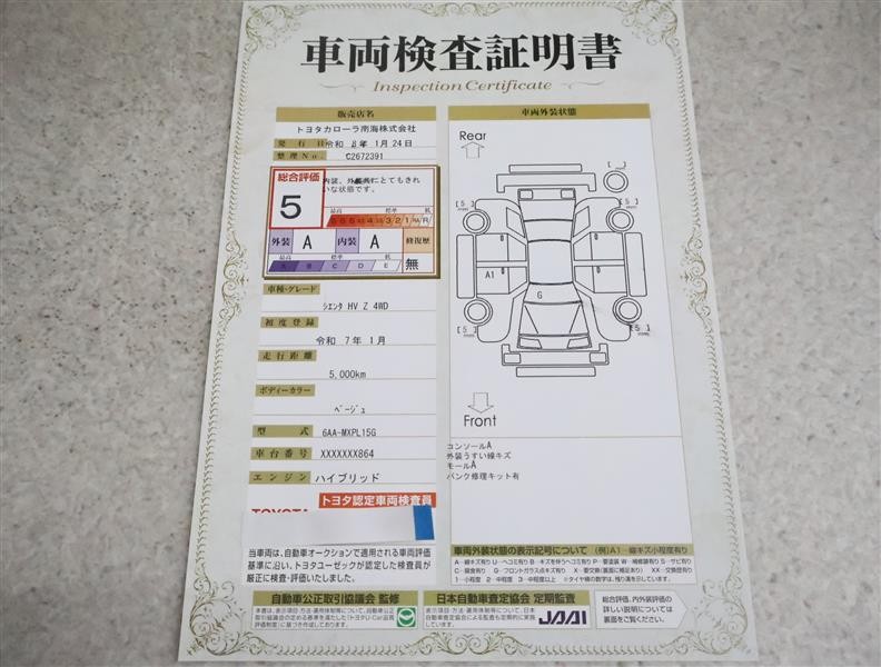 詳細及び現状の車両状態につきましては、店舗スタッフまでお尋ねください。 - 注2)上記と同様の評価点・状態表を「車両検査証明書」として店舗の展示車両に搭載しております。
