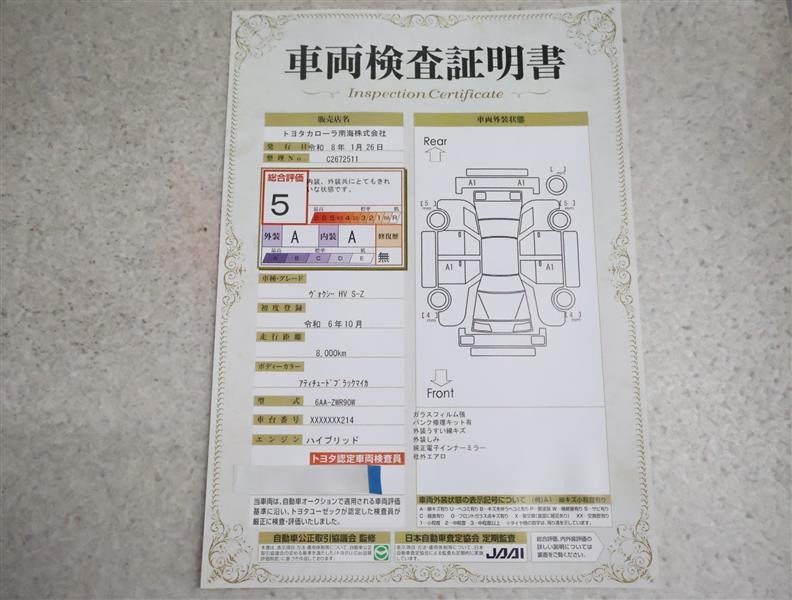 詳細及び現状の車両状態につきましては、店舗スタッフまでお尋ねください。 - 注2)上記と同様の評価点・状態表を「車両検査証明書」として店舗の展示車両に搭載しております。